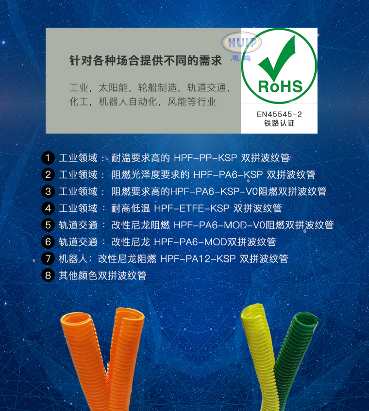 双拼波纹管经过优化的内表面保护了双层管的闭合性,并对电线电缆起到了很好的保护作用, 线束在安装过程中不受损失,并且对已有的线束和新设计线束的改造提供了很大的便利性,例如电厂的线路维修工程,如果线路停止运行,会造成无法预估的损失 ,还适用于机床,电柜,电气安装,空调制冷设备,机器人,自动化设备等。