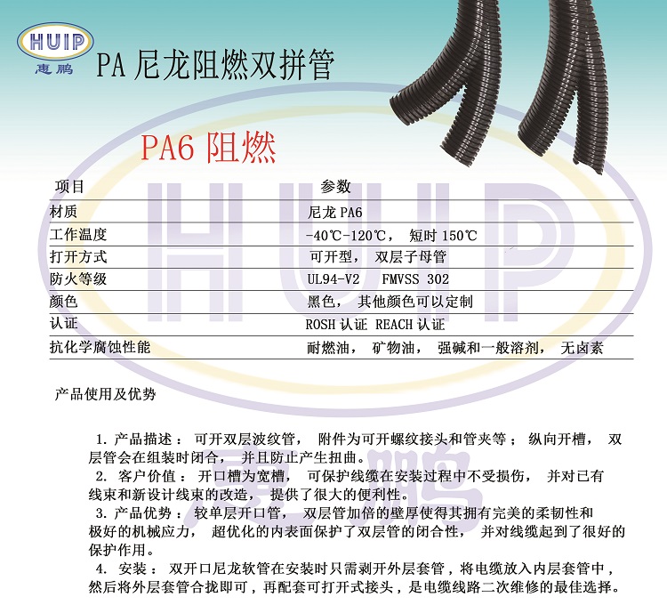 双拼波纹管组装时闭合,并且防止扭曲,同时,加倍的壁厚使双层管有更完美的柔韧性和极好的机械应力