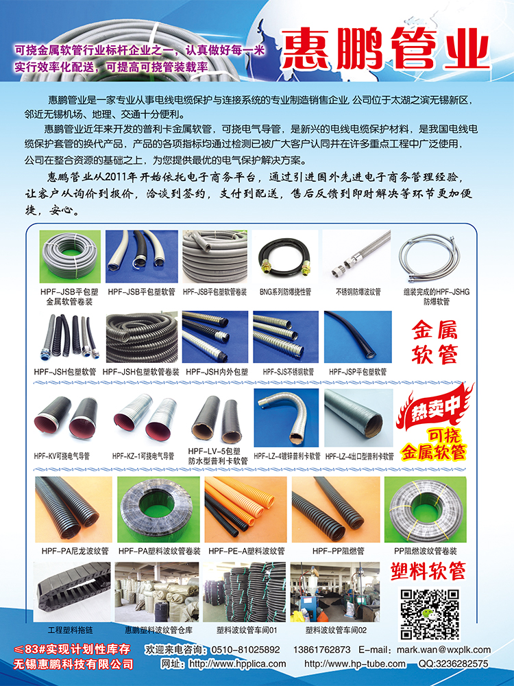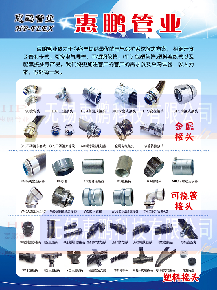 惠鹏管业致力于为客户提供最优的电气保护系统,旗下江苏接头厂也相继开发并及时供应各种金属软管配套的接头附件,相继开发了普利卡管,可挠电气导管,不锈钢软管,包塑软管,塑料波纹管以及相应的配套的软管接头等产品。(普利卡管接头,金属软管接头,不锈钢软管接头,波纹管快速接头,防水浪管接头,我们将更加注客户的客户的需求以及采购体验,以人为本,做好每一米可挠金属电线保护套管!惠鹏管业从2011年开始依托电子商务平台,公司相继和百度,阿里巴巴,淘宝等商务平台合作,引进国外先进电子商务管理经验,从而更便捷有效的管理询价到服务的一系列流程。公司在整合资源的基础之上,为您提供最优的电气保护解决方案。
